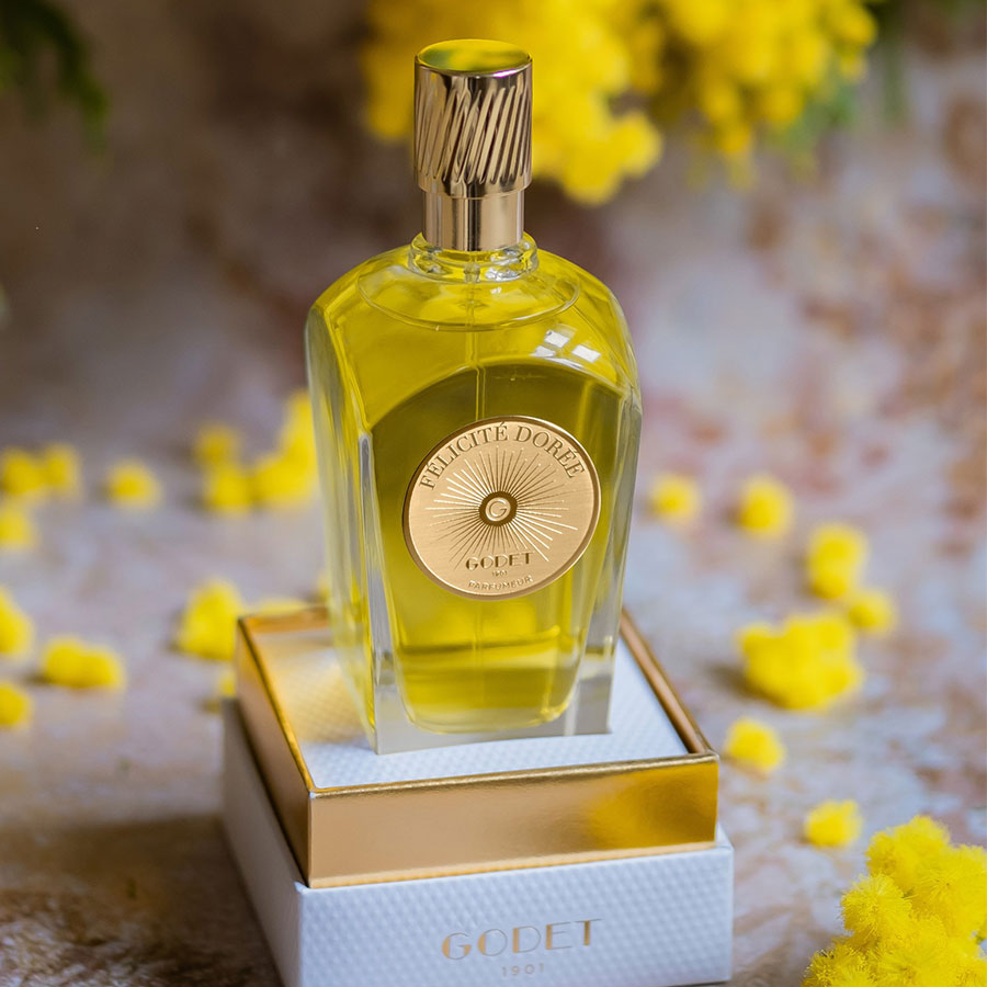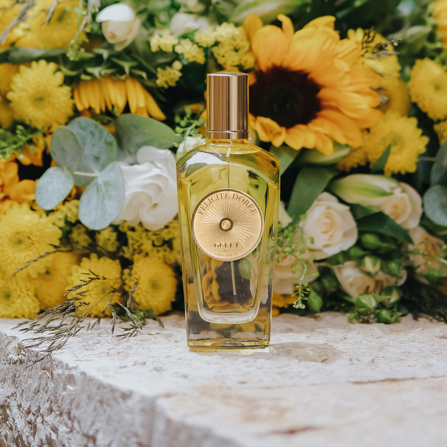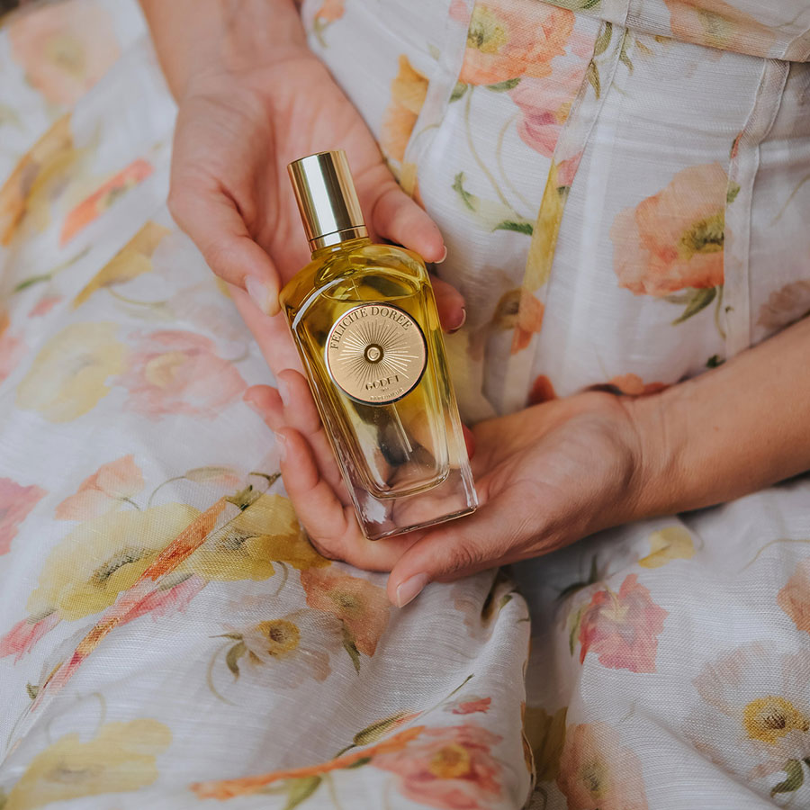 Échappée vivifiante, temps suspendu dans une forêt de mimosas… La création personnelle de Sonia Godet prend racine dans ses souvenirs d’enfance et rend hommage à l’énergie toute féminine que la parfumeuse incarne à merveille. Plus qu’un parfum, Félicité dorée a le goût du bonheur et de la joie de vie. Fleur solaire, force de l’ambre gris, douceur ouatée, la fragrance enveloppante de la créatrice est un philtre précieux empreint de magie.