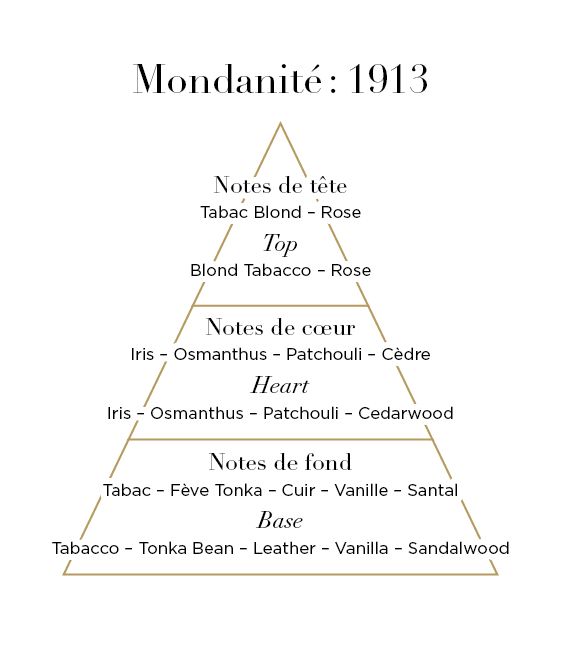 Mondanité perce autrement le mystère d’un cuir ambré sous la fumée du tabac blond, dans une réminiscence de fève tonka.