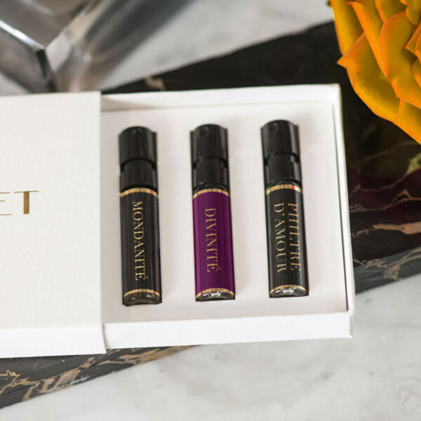 Divinité, Godet Philtre d’Amour, MondanitéTrois compositions extraverties mêlant bois précieux et ambres nobles.