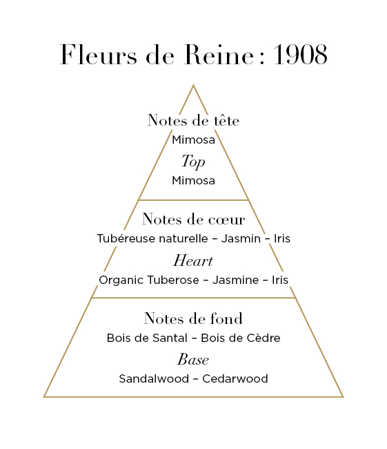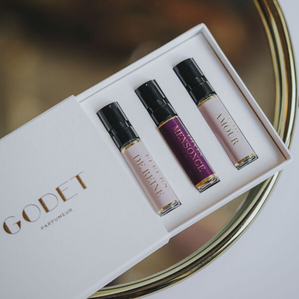 Fleurs de Reine, Par Amour, Divin MensongeLe cœur de Julien-Joseph Godet se mesure en battements de fleurs. Le doux jasmin irrigue une Petite Fleur Bleue qui jamais ne s’altère. Des Fleurs de Reine, en arborescence de trèfles, fourmillent de nobles tubéreuses. Divin Mensonge mêle gardénia, ylang-ylang et oud sacré dans une ambiance où tubéreuse nocturne et jasmin lunaire se défient, repoussant les limites. Et la féminité frappe au carreau du jeu de l’amour.