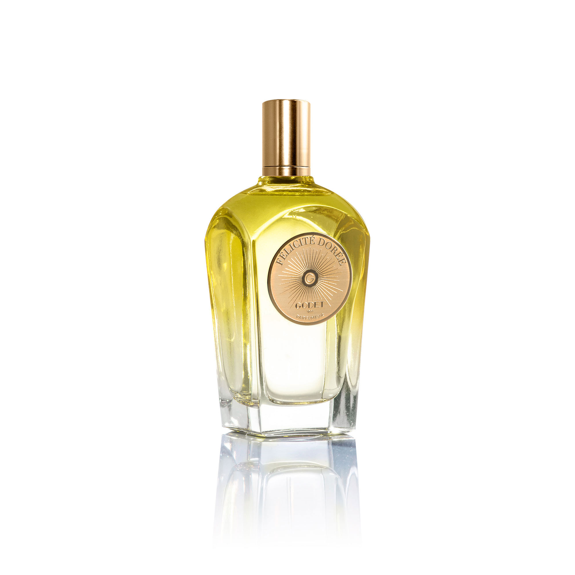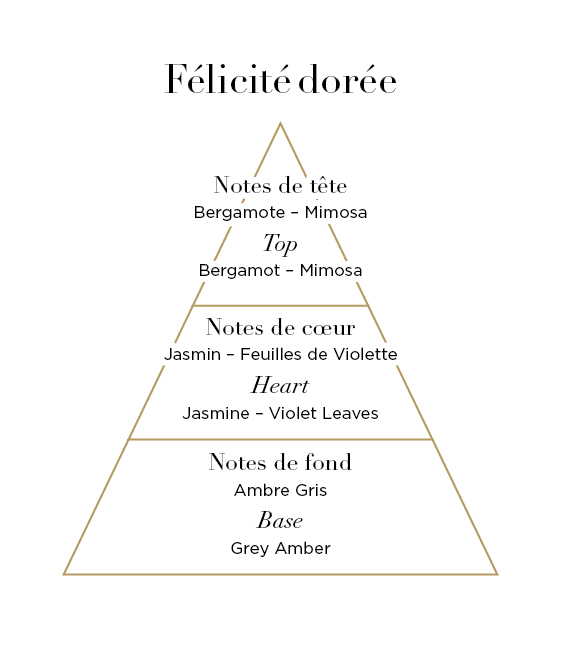Lumière du mimosa, force de l’ambre gris, douceur ouatée… Félicité dorée est un philtre enveloppant, une ode à la joie de vie et à la féminité.
